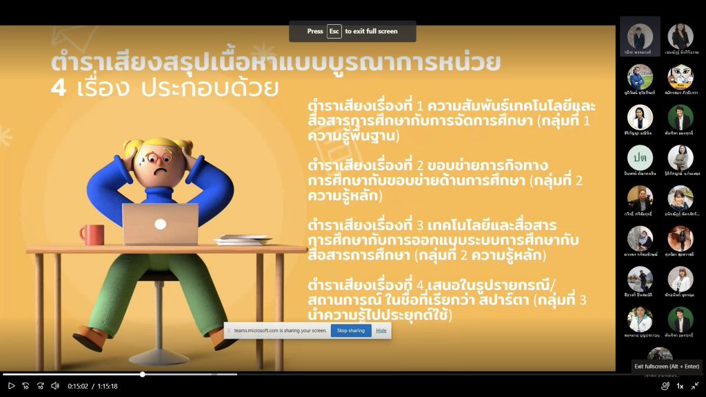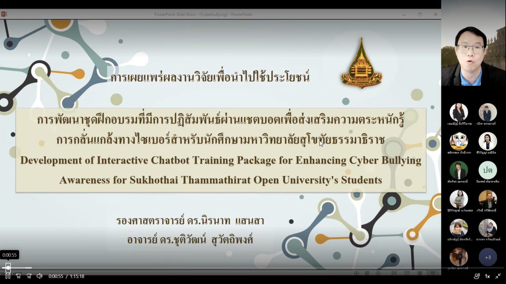 อ.ดร.ชุติวัฒน์ สุวัตถิพงศ์ ร่วมแลกเปลี่ยนเรียนรู้การทำวิจัย เรื่อง "การพัฒนาชุดฝึกอบรมที่มีการปฏิสัมพันธ์ผ่านแชตบอตเพื่อส่งเสริมความตระหนักรู้ การกลั่นแกล้งทางไซเบอร์สำหรับ/นักศึกษามหาวิทยาลัยสุโขทัยธรรมาธิราช" ในการประชุมคณาจารย์ ( MS Teams) ครั้งที่ 6/2565 เมื่อวันอังคารที่ 21 มิถุนายน 2565 เวลา 09.30-10.30 น.
