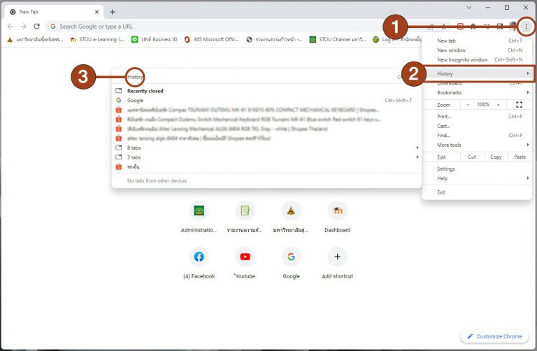คลิกด้านมุมบนด้านขวา (จุดที่ 1) เลื่อนเมาส์ไปที่ History หรือ ประวัติการเข้าชม คลิก (จุดที่ 2) เลื่อนเมาส์คลิก History คลิก (จุดที่ 3 )