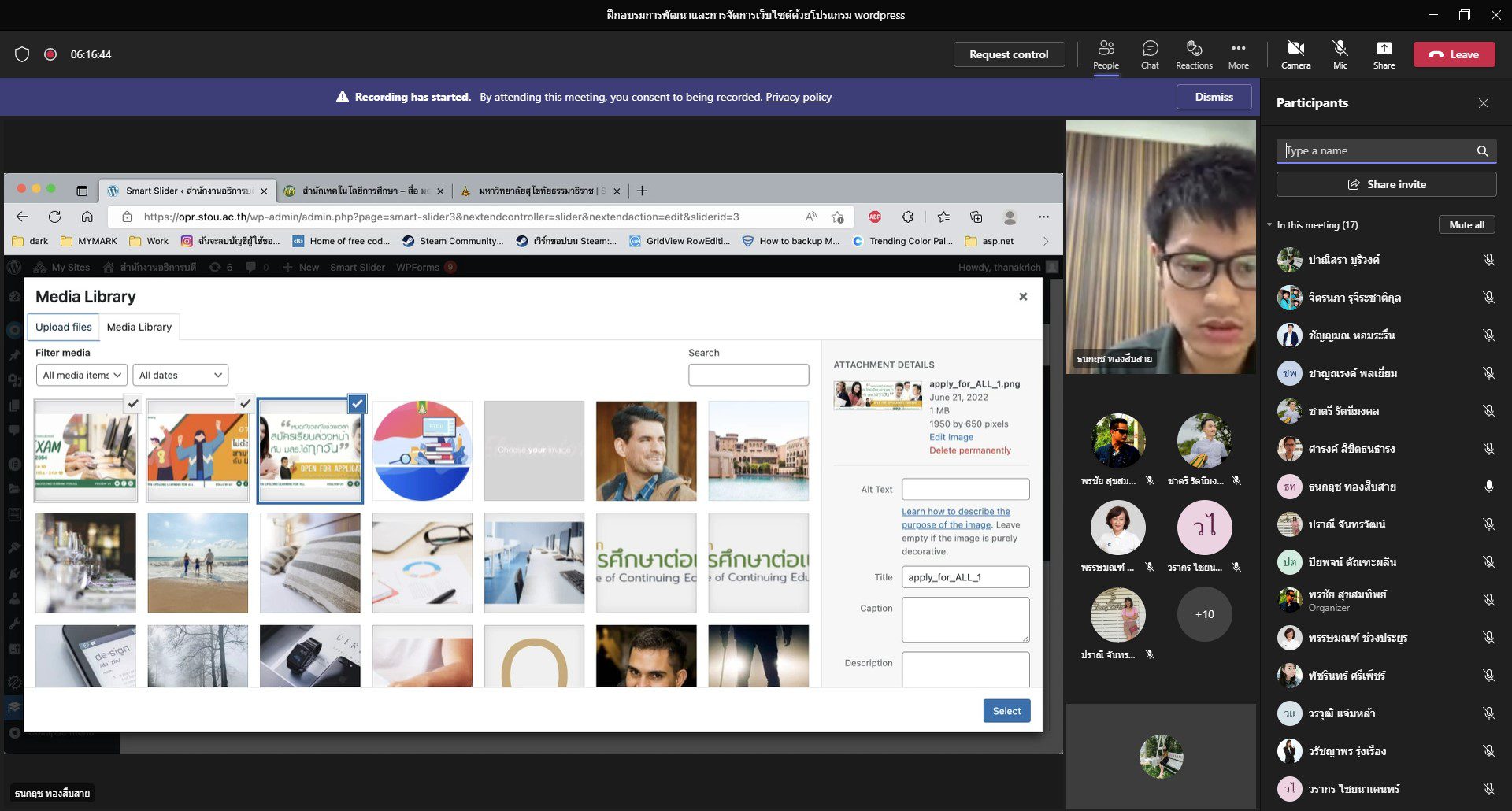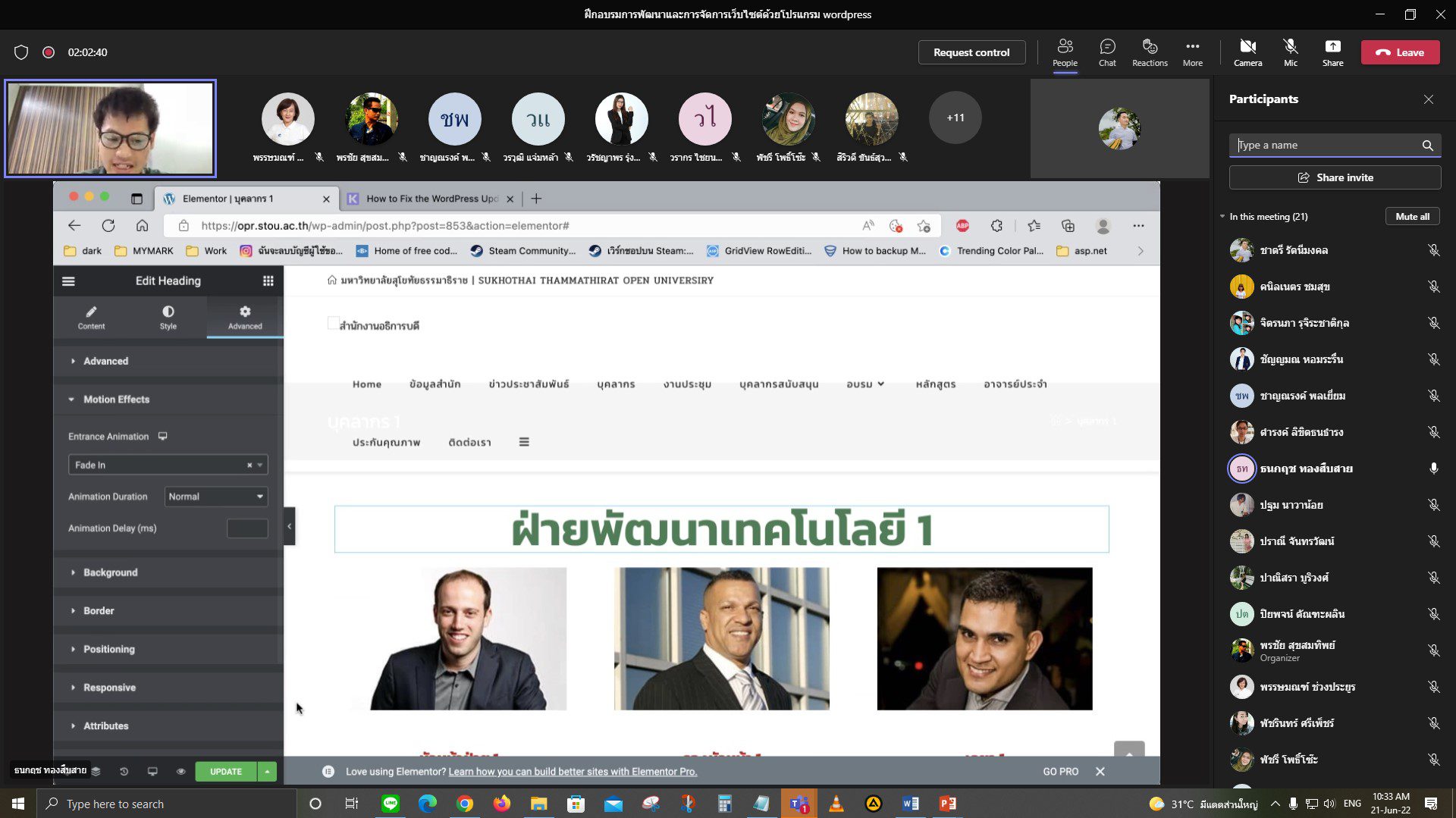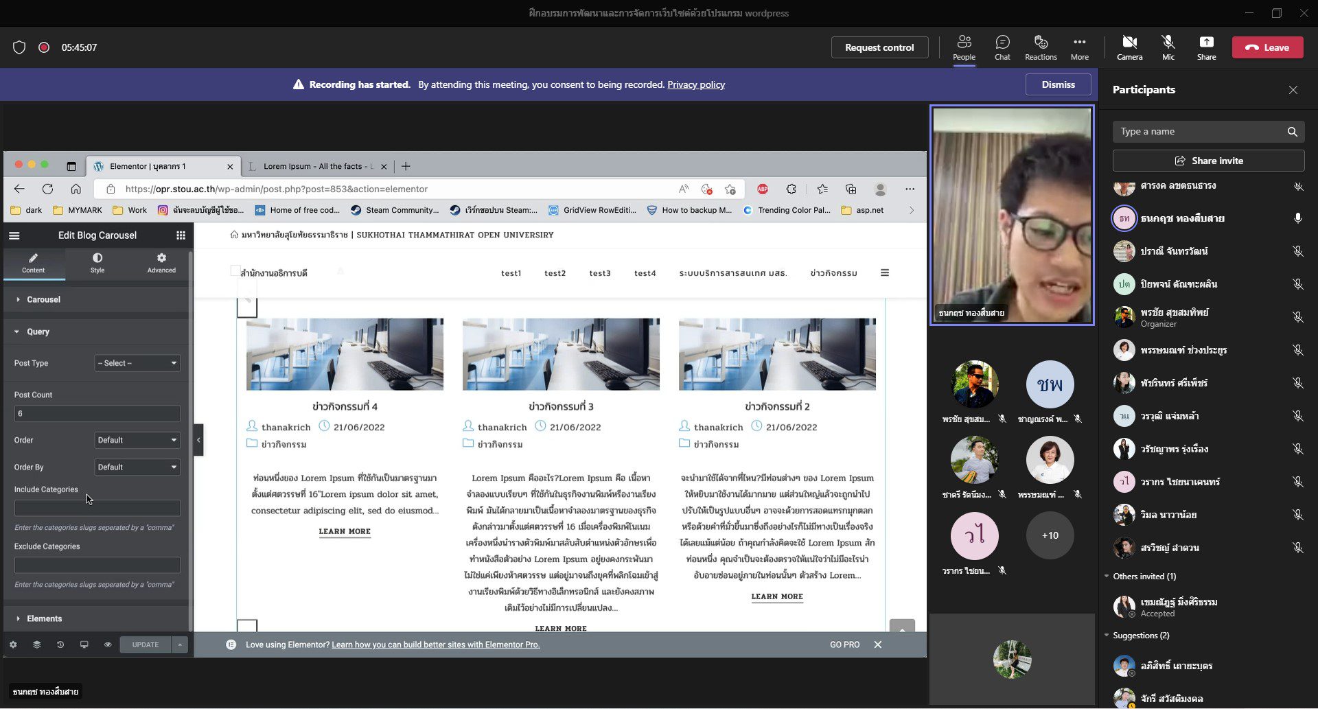 เมื่อวันที่ 21 มิถุนายน 2565 ศูนย์การเรียนการสอนทางอิเล็กทรอนิกส์ สำนักเทคโนโลยีการศึกษา ได้มีการจัดฝึกอบรมเชิงปฏิบัติการออนไลน์ผ่านโปรแกรม Microsoft Teams เรื่อง การพัฒนาและการจัดการเว็บไซต์ด้วยโปรแกรม wordpress ให้บุคลากรของสำนักเทคโนโลยีการศึกษา  เพื่อสามารถสร้างและจัดการเว็บไซต์ของหน่วยงานตนเอง