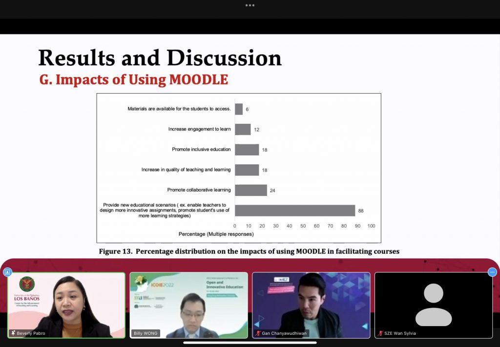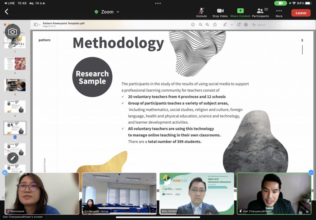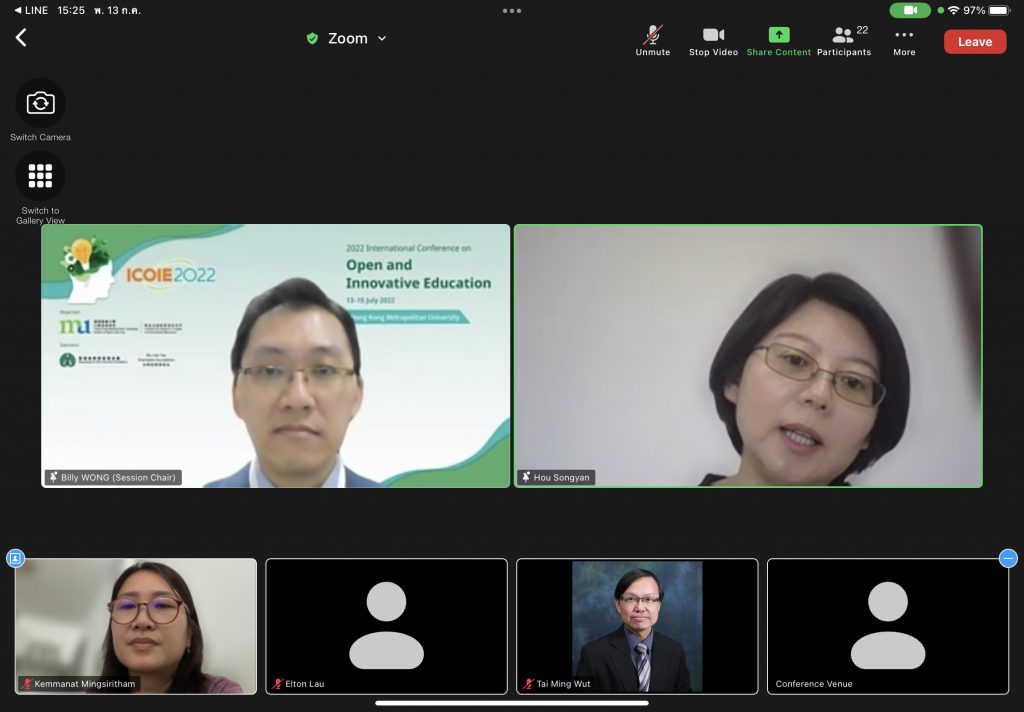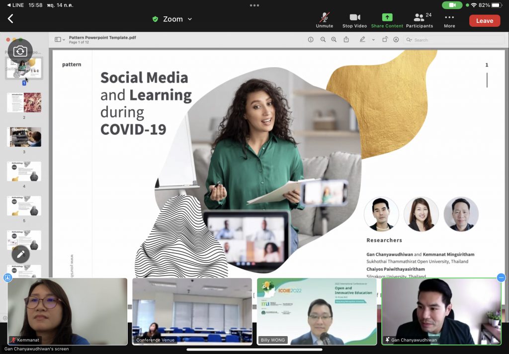 เมื่อวันที่ 13-15 กรกฎาคม 2565 ผศ.ดร.กรรณ จรรยาวุฒิวรรณ์ และ รศ.ดร.เขมณัฏฐ์ มิ่งศิริธรรม เข้าร่วมประชุมและนำเสนองานวิจัยแบบออนไลน์ เรื่อง “Social Media and Learning during COVID-19 ในการประชุมวิชาการระดับนานาชาติ “the 2022 International Conference on Open and Innovative Education (ICOIE 2022)” จัดโดย Hong Kong Metropolitan University